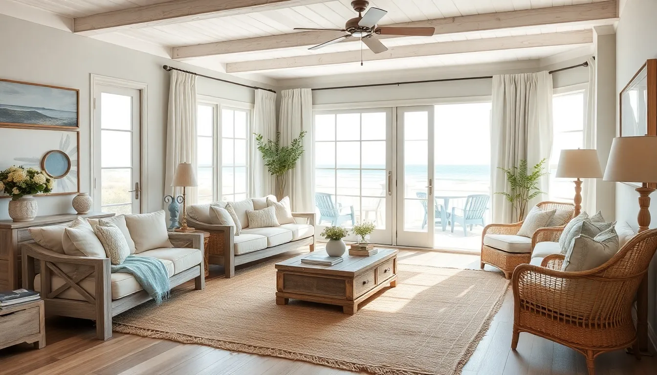 Furniture in coastal design favors casual, oversized pieces that invite comfort and relaxation. Sofas, sectionals, and chairs often showcase soft fabrics and light colors, providing a welcoming atmosphere. The inclusion of slipcovers simplifies maintenance while enhancing the airy vibe of the room. Materials like rattan and wicker contribute texture, fostering a laid-back beach house feel. Occasional tables made from reclaimed wood further enhance this aesthetic, marrying elegance with functionality. Prioritizing comfort ensures that spaces encourage social interaction and relaxation, embodying the true essence of coastal living.