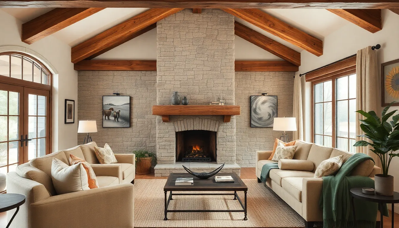 Neutral color palettes dominate modern rustic interiors, emphasizing earthy tones. Colors like soft browns, grays, and whites establish a serene backdrop, allowing natural materials to shine. Accents of muted greens or warm terracotta can introduce subtle hints of color, providing visual warmth. These color choices promote a calming ambiance, making spaces feel open and inviting. Textured textiles in similar tones enhance the tranquil atmosphere while maintaining a cohesive look. Using neutral shades brings sophistication without overwhelming the senses, creating a harmonious balance in decor.